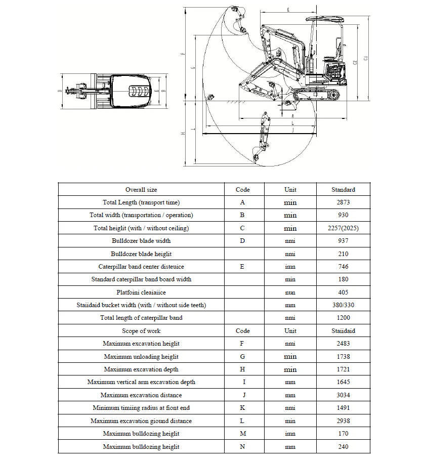 Mini-excavator weight: 1050 kg